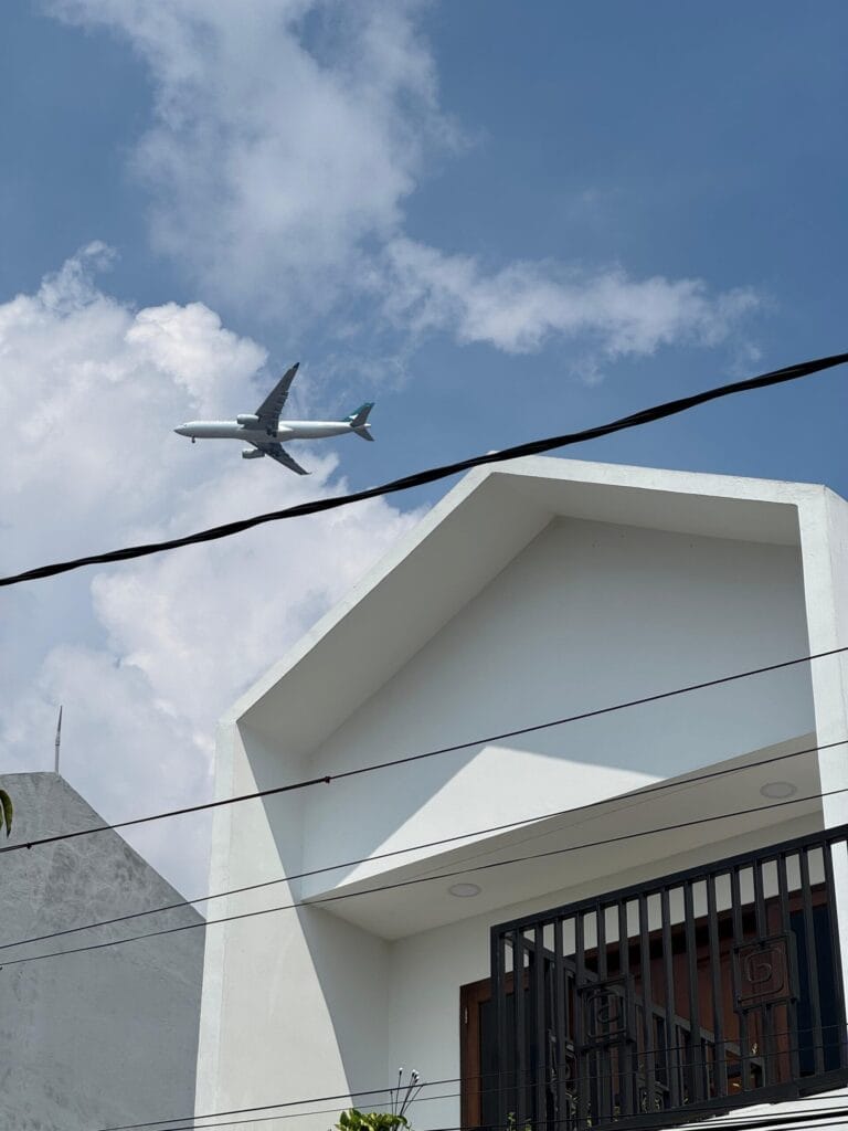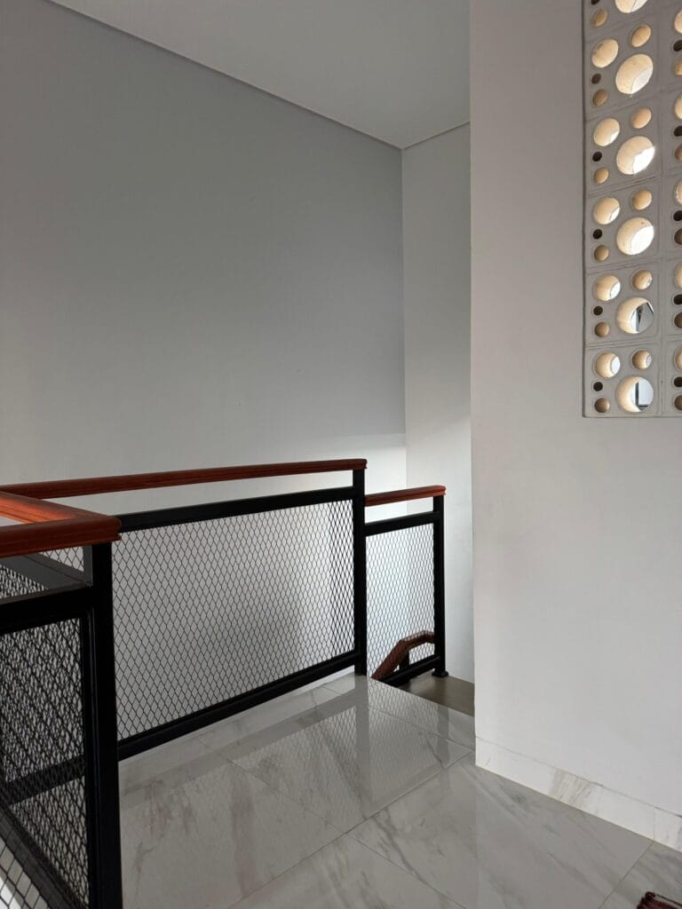 Void tinggi berada tepat di atas tangga dan terbuka hingga lantai atas sehingga udara panas dapat naik secara alami karena perbedaan suhu. Udara dari bawah tertarik masuk dan bergerak ke atas melalui ruang ini sehingga tidak terjadi penumpukan panas di lantai bawah. Kondisi ini menjaga kenyamanan pada rumah minimalis tanpa tambahan sistem mekanis.