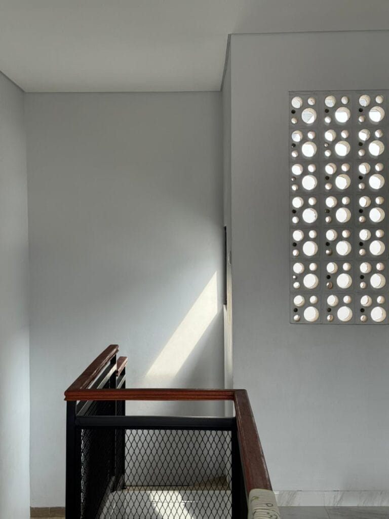 Dinding roster berdiri di sisi tangga dan sejajar dengan arah naik pijakan sehingga cahaya masuk dari samping dan jatuh miring ke anak tangga serta sudut pertemuan dinding dan lantai. Saat berdiri di tangga pada pagi hari, bayangan terlihat tajam dan membentuk garis diagonal yang jelas. Area ini menjadi titik terang di bagian tengah rumah yang sebelumnya jauh dari fasad.